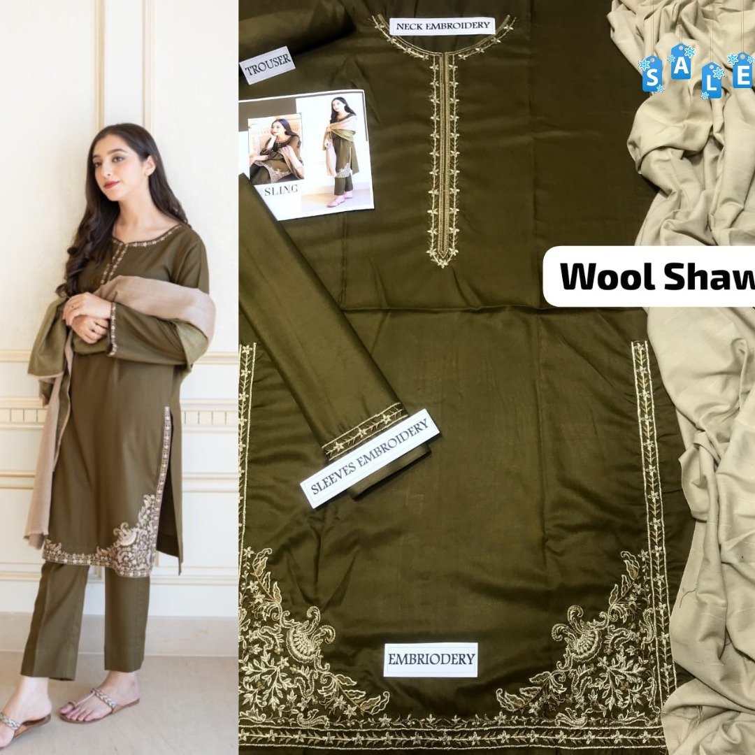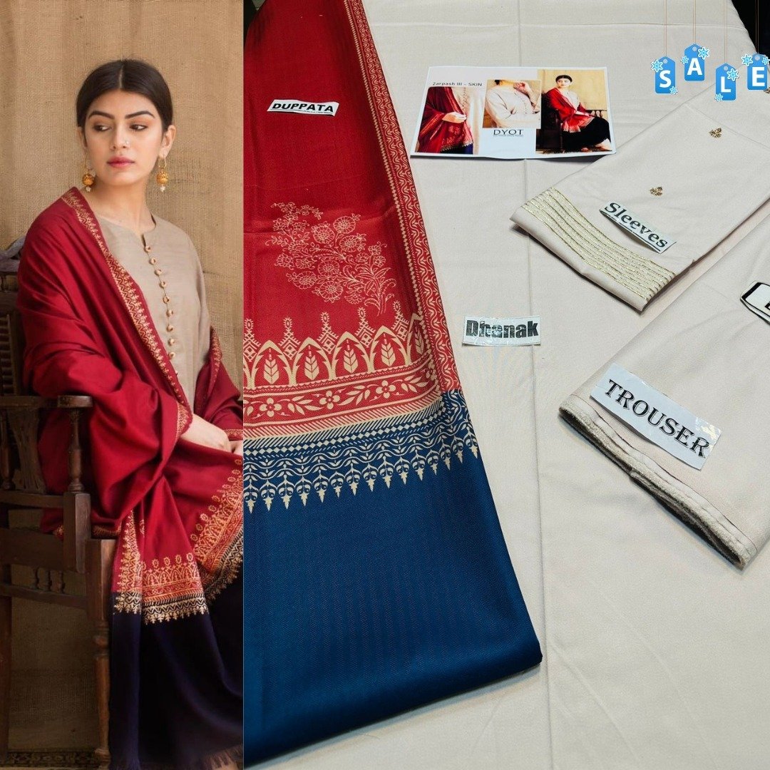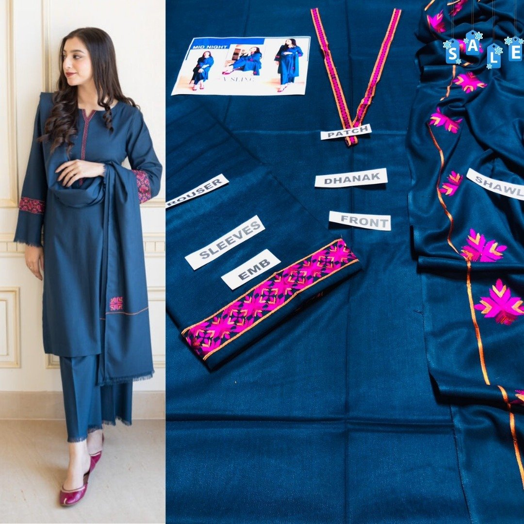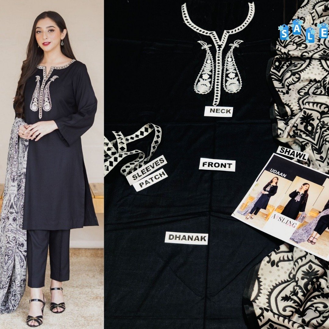 •Plain dhanak front (Embroidered Patch Work) •Embroidered dhanak sleeves •Digital printed/embroidered shawl •Dyed dhanak trouser