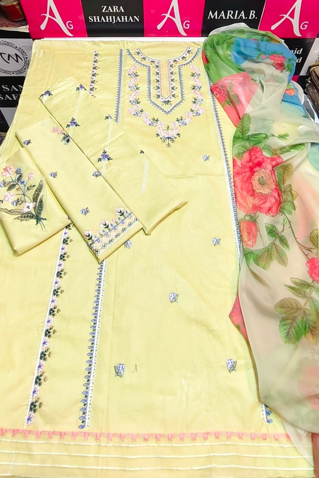 •Embroidered lawn front (Embroidered Daman Patch) •Embroidered lawn sleeves •Digital printed swiss lawn dupatta •Embroidered lawn trouser