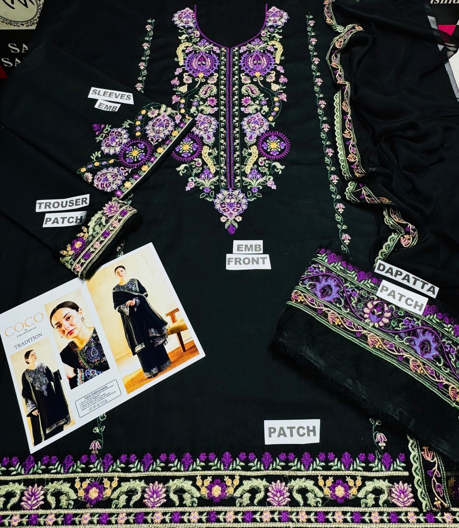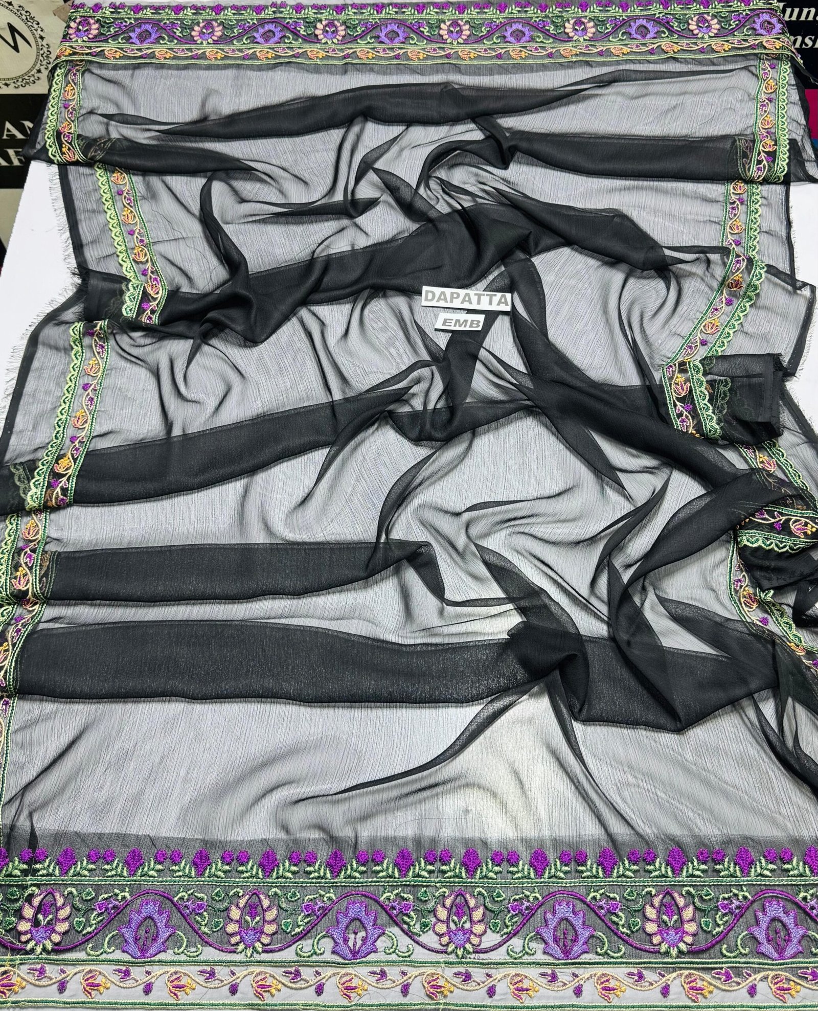 •Heavy embroidered lawn front (Embroidered Daman Patch) •Embroidered lawn sleeves •Heavy embroidered bamber chiffon dupatta (Embroidered Pallu Patches) •Dyed lawn trouser (Embroidered Patch)