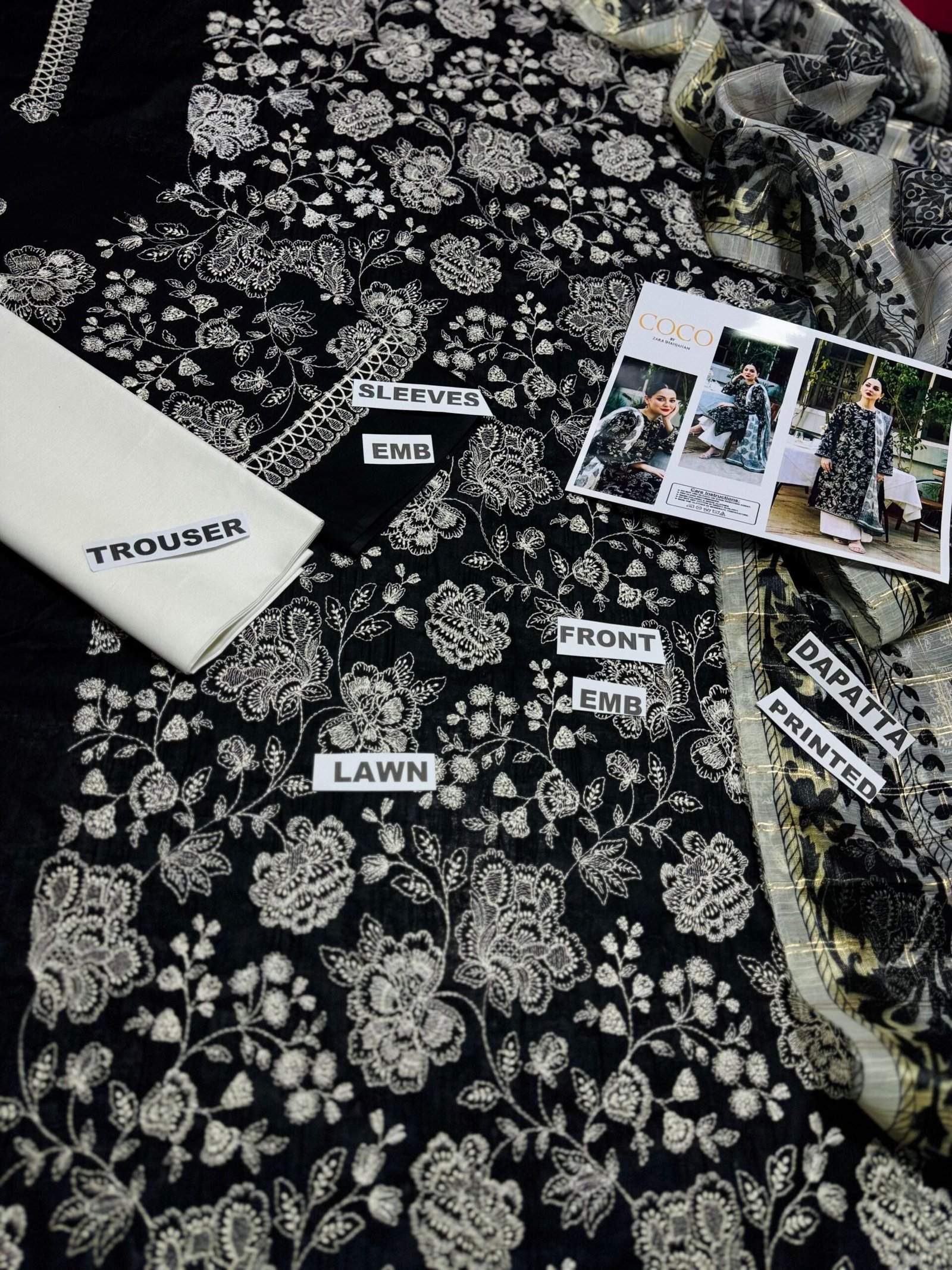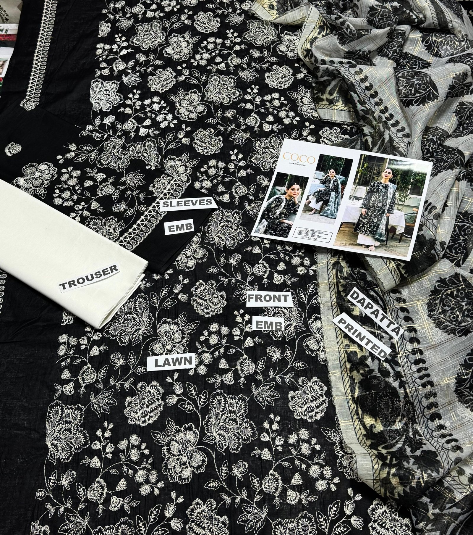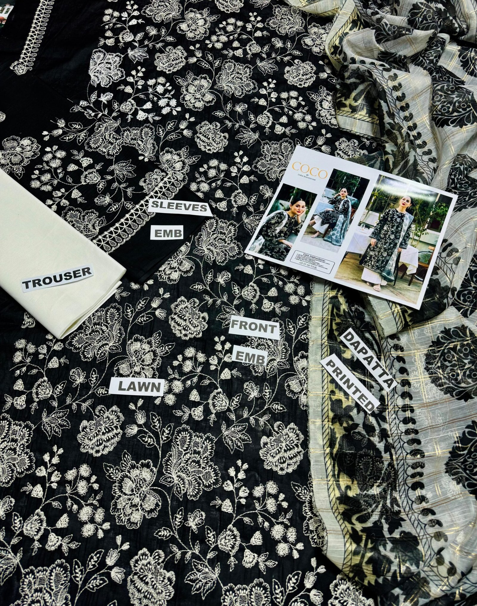 •Embroidered lawn front •Embroidered lawn sleeves •Digital printed zari dupatta •Dyed lawn trouser